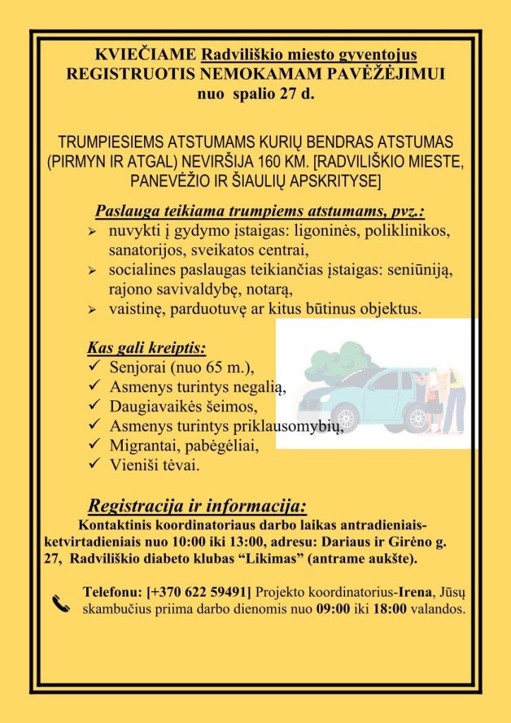Nuo spalio 27 dienos Radviliškio miesto gyventojams suteikta galimybė nemokamai vykti į gydymo, socialinės priežiūros bei kitas svarbias įstaigas. Paslauga teikiama trumpais atstumais – iki 160 kilometrų pirmyn ir atgal, apimant Radviliškio miestą, Šiaulių ir Panevėžio apskritis.