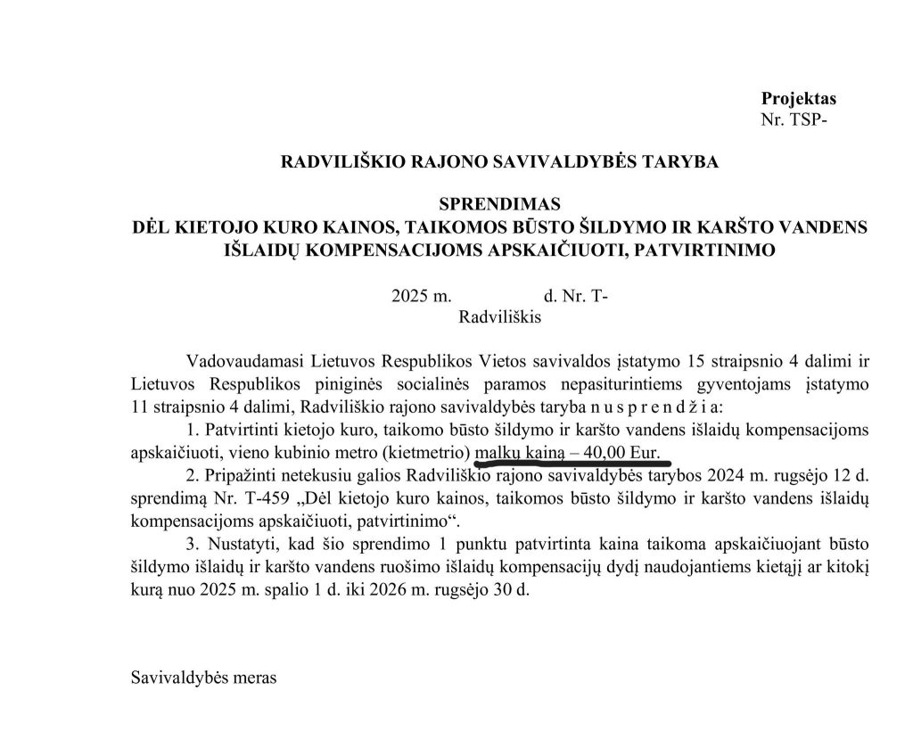 pateikė sprendimo projektą (kopiją pridedu), kuriuo siūlė sumažinti kietojo kuro (malkų) kainą kompensacijoms – nuo 52 iki 40 eurų už vieną kubinį metrą.