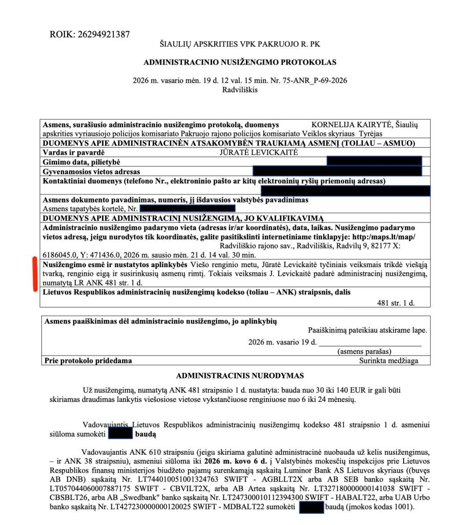Iki šiol dalis sausio 21-osios politinio susitikimo Radviliškyje dalyvių konfliktą bandė aiškinti kaip „pilietinį aktyvumą“ ar „jaunimo kritiką“. Tačiau 2026 m. vasario 19 d. teisėsaugos sprendimas šią interpretaciją iš esmės pakeitė – buvo surašytas administracinio nusižengimo protokolas dėl tyčinio viešosios tvarkos trikdymo.