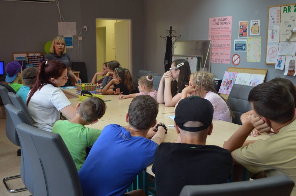 Tad toliau lankome atostogomis besimėgaujančius vaikus ir lankomės Radviliškio parapijos bendruomenės socialinių paslaugų centro vaikų dienos centre ,,Ąžuoliukas“, kur su vaikais diskutuota apie saugų internetą, prekybą žmonėmis ir saugų elgesį gatvėje bei kieme.
